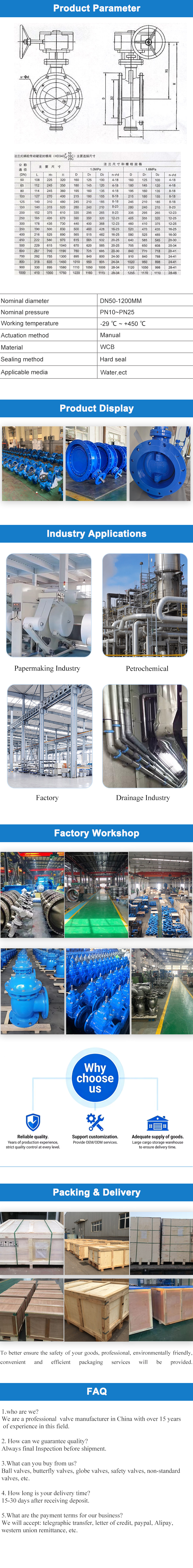 The turbine double eccentric flange butterfly valve is an industrial butterfly valve designed with a double eccentric structure, manually driven by turbine deceleration, and flange connection. The valve stem and butterfly plate are rotated by increasing the torque of the turbine box, and the double eccentric principle is used to achieve frictionless separation between the butterfly plate and the v