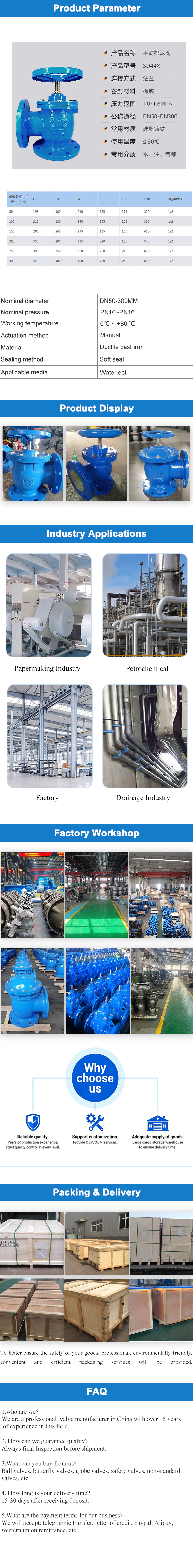 The manual angle type mud draine valve is a 90 ° angle type manual quick opening mud discharge special valve, with the core advantages of angle type channel blockage prevention, soft seal zero leakage, manual quick opening labor-saving, and adaptability to sediment containing sewage. Widely used for the discharge of sediment and pollutants at the bottom of water plants, sewage treatment plants,ect