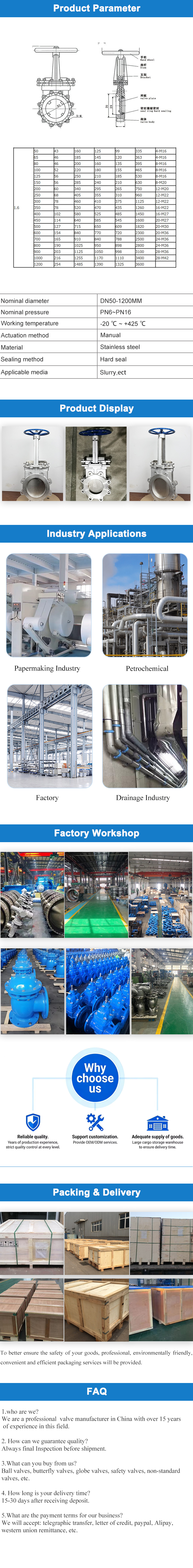 The manual stainless steel plum blossom knife gate valve is made of 304/316/316L austenitic stainless steel as the core valve body material, and adopts a plum blossom knife gate plate+bidirectional seal+manual spiral lifting drive design. We specialize in cutting off and controlling media containing particles and slurry in industries such as mining, chemical, and wastewater treatment.