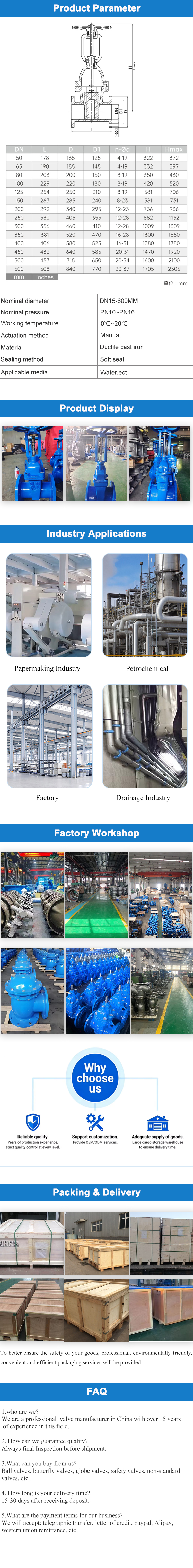 The manual soft seal rising stem gate valve is made of ductile iron or stainless steel as the valve body material, and adopts a design of integral rubber coated elastic gate plate+rising stem lifting structure+manual flange connection. It is a basic fluid control component in the fields of municipal, construction, environmental protection, etc.
