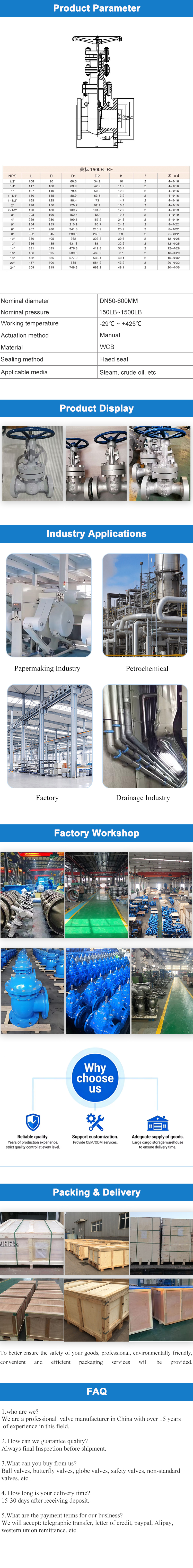 Manual Ansi carbon steel gate valve is a straight through block valve designed and manufactured in accordance with American valve standards (API 600, ASME B16.34), with carbon steel as the main material and handwheel drive. By rotating the handwheel to drive the valve stem up and down, the gate can be vertically opened and closed, thereby cutting off or connecting the pipeline medium.