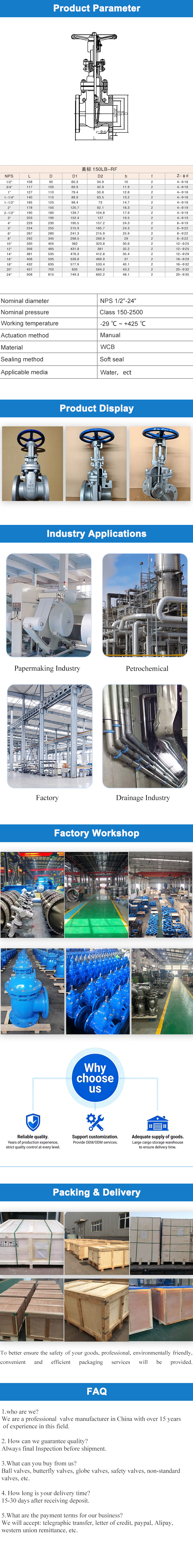 The ANSI cast steel gate valve is made of ASTM A216 WCB, A217 WC6/WC9 cast steel as the core material, and adopts a core design of concealed rod+wedge type elastic gate plate+flange connection, which complies with API 600/6D, ASME B16.34/B16.5 and other standards.