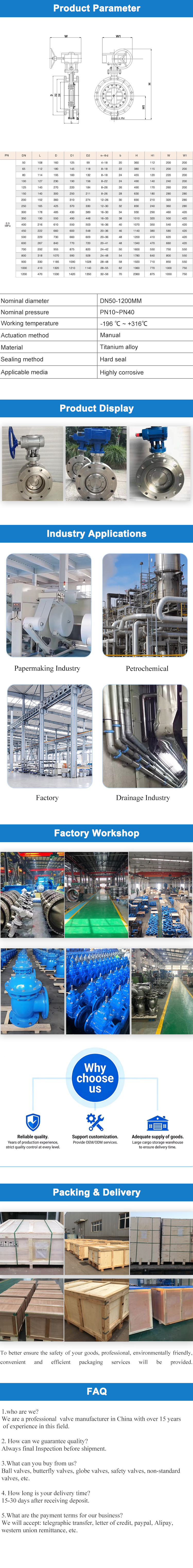 The manual flange titanium alloy butterfly valve is made of TA1/TA2/TC4 titanium alloy as the core material, and adopts a core design of titanium alloy full material corrosion resistance, double/triple eccentric sealing, 90 ° fast opening and closing, and stable flange installation.