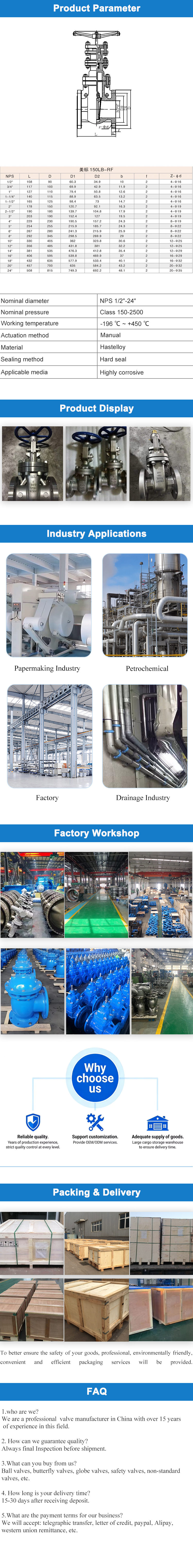 ANSI Hastelloy flange gate valve is made of Hastelloy C-276/C-4/B-3/G-30 nickel based Hastelloy alloy as the core material. Its core advantages include ultimate corrosion resistance of Hastelloy alloy, American standard API 600/6D, wedge elastic seal, and stable flange connection.